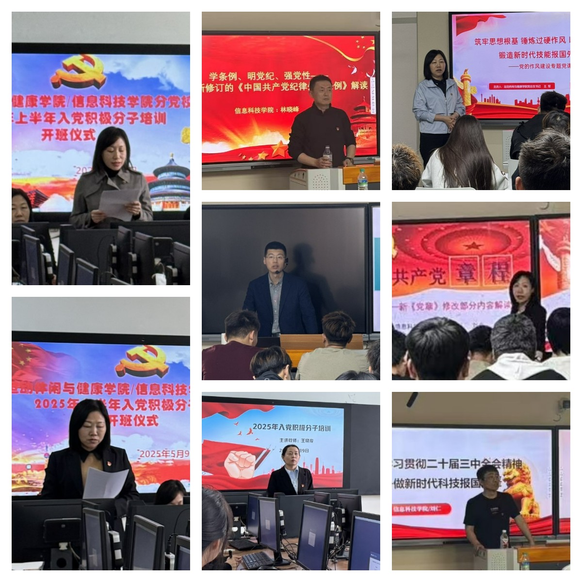 开班仪式上,信息科技学院党总支书记刘焱宣读培训方案,运动休闲与健康学院党总支书记王军作动员讲话,鼓励学员们端正入党动机,珍惜学习机会,做到学有所思、学有所悟、学有所行。理论学习环节,分党校邀请马克思主义学院教师姜春田解读了习近平新时代中国特色社会主义思想,让广大积极分子领略马克思主义与中国发展相结合的伟大进程;信息科技学院党总支书记刘焱为广大积极分子解读《中国共产党章程》,帮助积极分子原汁原味学理论;运动休闲与健康学院党总支书记王军以“筑牢思想根基锤炼过硬作风——以优良学风锻造新时代技能报国先锋”为题讲授了党的作风建设专题党课,结合培育优良学风校风,强化理想信念教育;信息科技学院院长林晓峰解读《中国共产党纪律处分条例》、运动休闲与健康学院党总支副书记沈浩博讲授《中国共产党廉洁自律准则》,使广大积极分子能够明底线,知进退;信息科技学院副院长刘仁结合信息科技行业发展现状,解读了党的二十届三中全会精神,进一步增强政治认同、理论自信和行动自觉。
